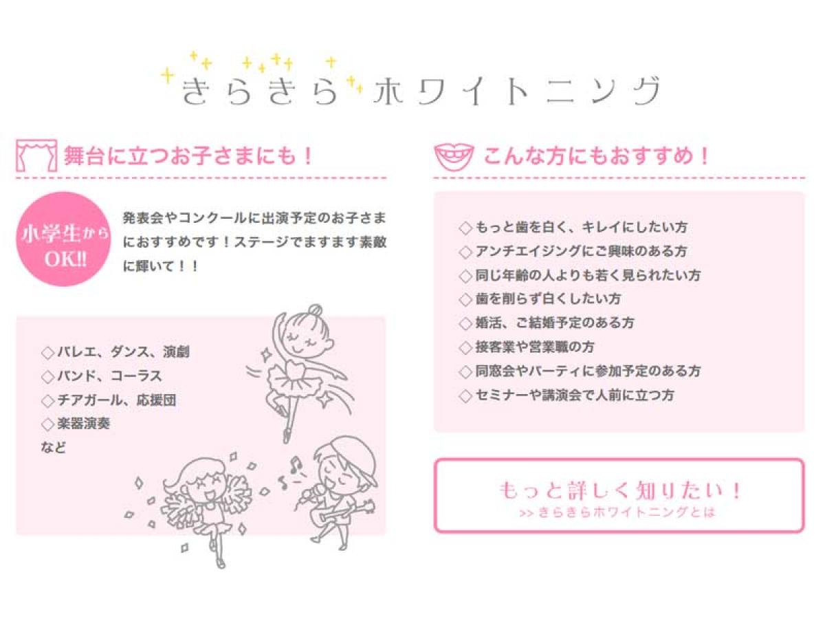 すてきな笑顔はとても魅力的です。美しい口元を保つためにもホワイトニングはおすすめです。柳原歯科医院がおすすめする『きらきらホワイトニング』は、歯の本来の美しさとお口の健康を保てます。歯を白くするだけでなく笑顔も心も輝かせるデンタルエステ。心から笑顔になりたい方を柳原歯科医院は応援します。気軽な気持ちで一度お試しいただき昨日までとは違う自分を実感してください。