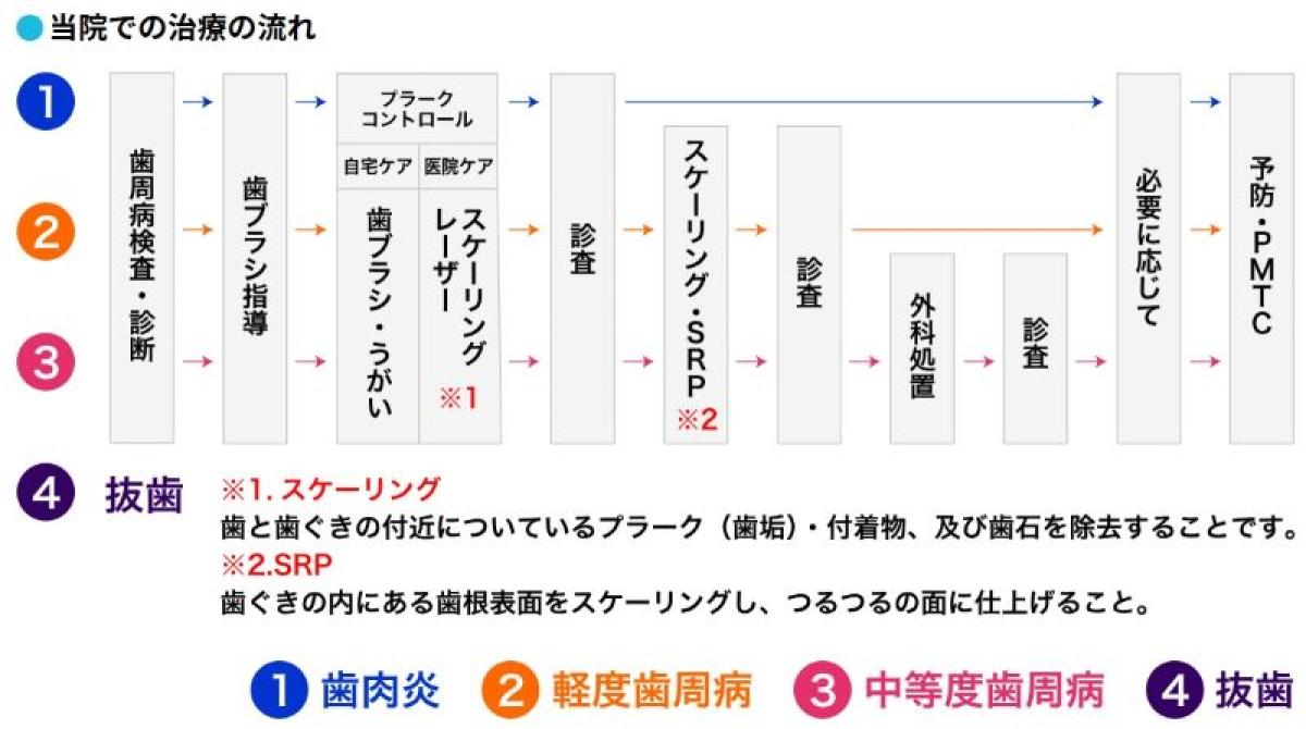 当院での治療の流れとしては、まず検査・診断をして歯ブラシ指導しています。歯周病の進行を防ぐためにはセルフケアがとても大切です。歯垢を取り除き、炎症を抑えるためのケアで改善することができます。また、正しいセルフケアを継続することで再発を防ぐことができます。セルフケアと並行して歯科医でのケアも必要となります。歯磨きでは取れないプラ―ク(歯垢)や付着物、歯石を除去したり、歯茎の中にある歯根表面をスケーリングしつるつるの面に仕上げたりして口腔内の環境を変えています。その他にかみ合わせの調整や、レーザーによるポケット殺菌、投薬による歯周内治療、歯周外治療なども行っています。治療後、健康になった歯周組織の健康を維持するためにGBT®メンテナンスによってコントロールしています。